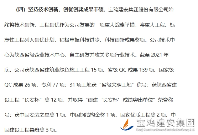 通報(bào)文件第二部分對(duì)參評(píng)企業(yè)特色及亮點(diǎn)進(jìn)行了點(diǎn)名評(píng)述,其中第四版塊“堅(jiān)持技術(shù)創(chuàng)新,創(chuàng)優(yōu)創(chuàng)獎(jiǎng)成果豐碩”一欄,對(duì)我司進(jìn)行了專(zhuān)門(mén)評(píng)介:“寶雞建安集團(tuán)股份有限公司始終將技術(shù)創(chuàng)新、工程創(chuàng)優(yōu)作為公司發(fā)展的一項(xiàng)重大戰(zhàn)略舉措,將重大工程、標(biāo)志性工程列入創(chuàng)優(yōu)計(jì)劃,積極申報(bào)科技進(jìn)步、科技創(chuàng)新成果獎(jiǎng)項(xiàng)。公司技術(shù)中心為陜西省級(jí)企業(yè)技術(shù)中心,自主研發(fā)并攻關(guān)多項(xiàng)行業(yè)技術(shù)。截至2021年底,公司獲陜西省建筑業(yè)綠色施工工程15項(xiàng)、省級(jí)QC成果139項(xiàng)、國(guó)家級(jí)QC成果26項(xiàng)、專(zhuān)利77項(xiàng);31項(xiàng)工地獲“省級(jí)文明工地”稱(chēng)號(hào);獲陜西省建設(shè)工程“長(zhǎng)安杯”獎(jiǎng)12項(xiàng),并取得“創(chuàng)建‘長(zhǎng)安杯’成績(jī)突出單位”榮譽(yù)稱(chēng)號(hào);獲中國(guó)安裝之星獎(jiǎng)1項(xiàng)、中國(guó)鋼結(jié)構(gòu)金獎(jiǎng)1項(xiàng)、國(guó)家優(yōu)質(zhì)工程獎(jiǎng)2項(xiàng)、中國(guó)建設(shè)工程魯班獎(jiǎng)3項(xiàng)?!?/span>